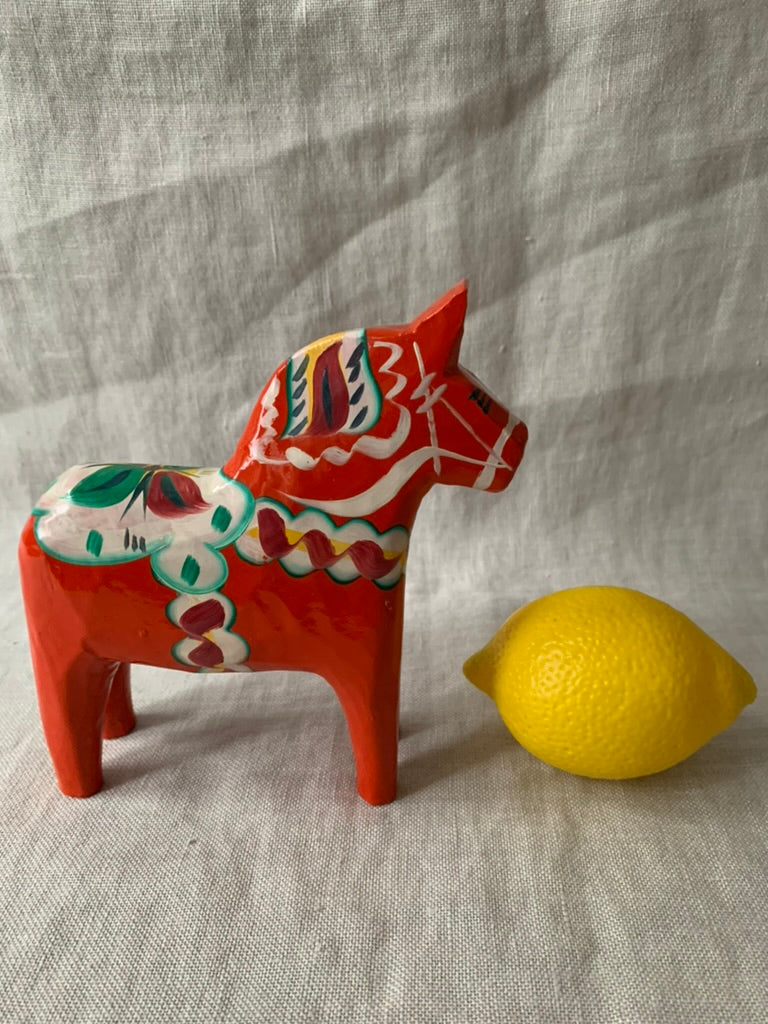 Original vintage Swedish Dalar horse in the traditional red color and hand painted decoration.