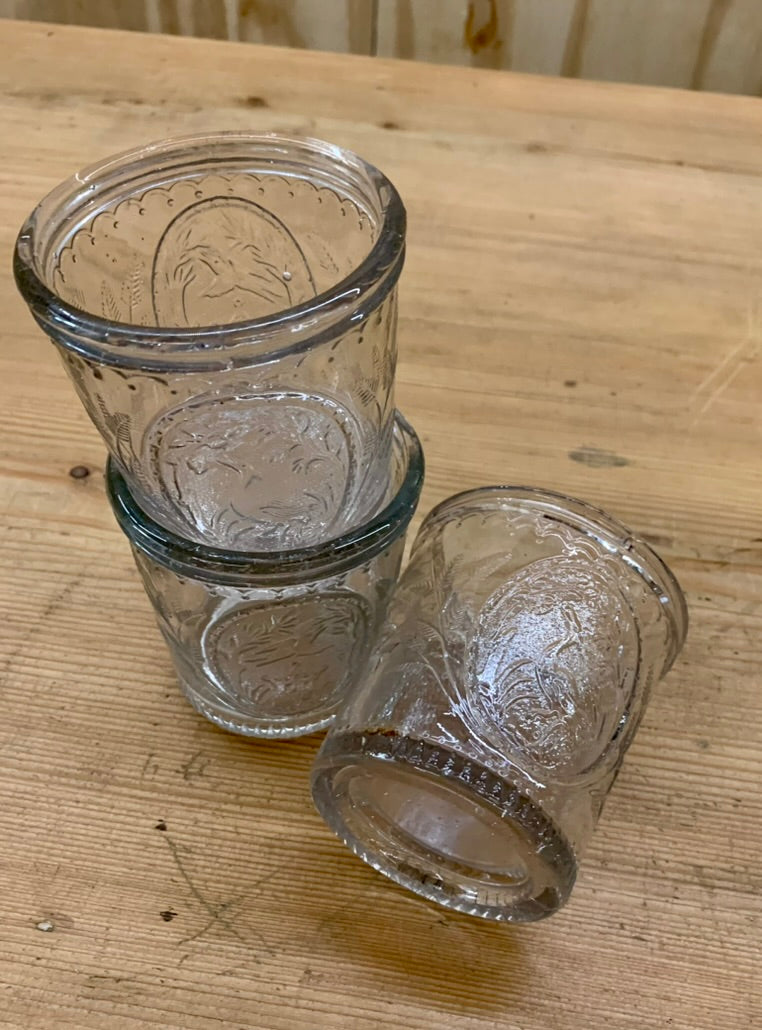 Vintage French pot á confiture jam jar in pressed glass with chinoiserie motives.