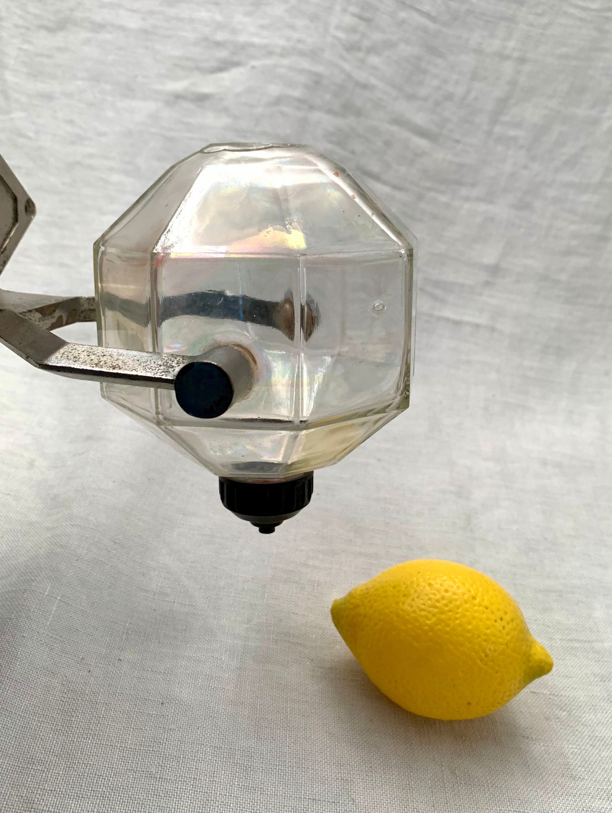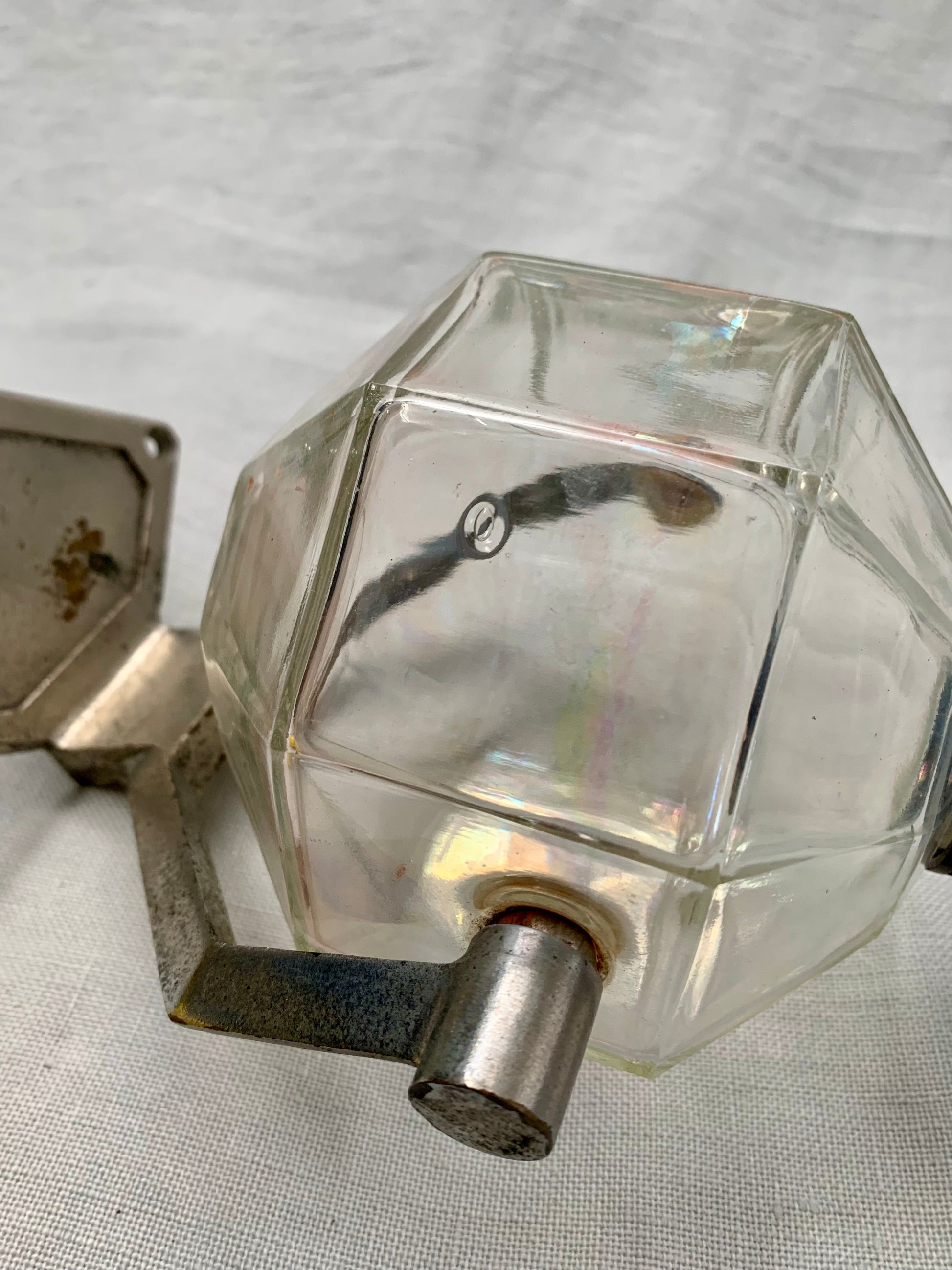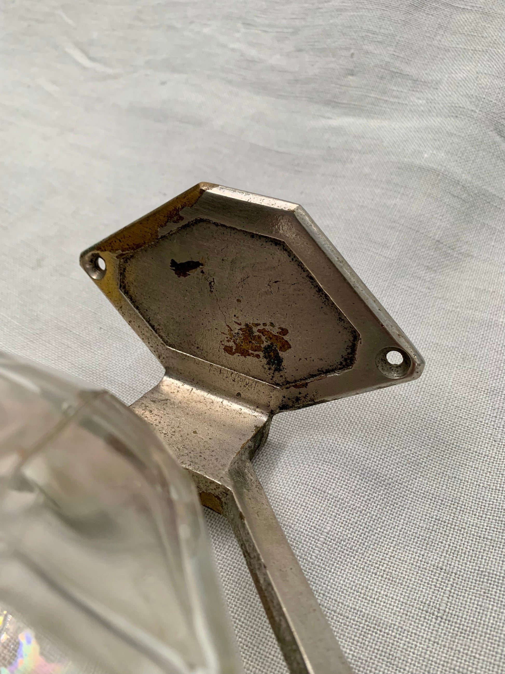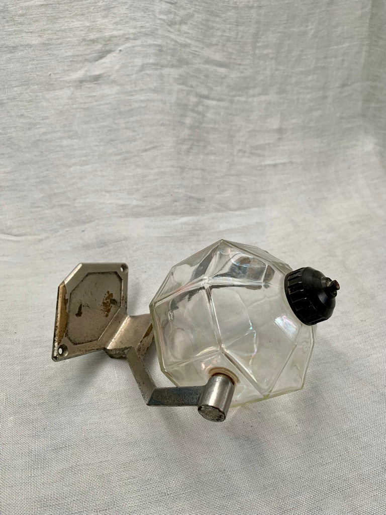 The coolest vintage Art Deco soap dispenser to be mounted on the wall. With patinated chrome bracket and bakelite spout.