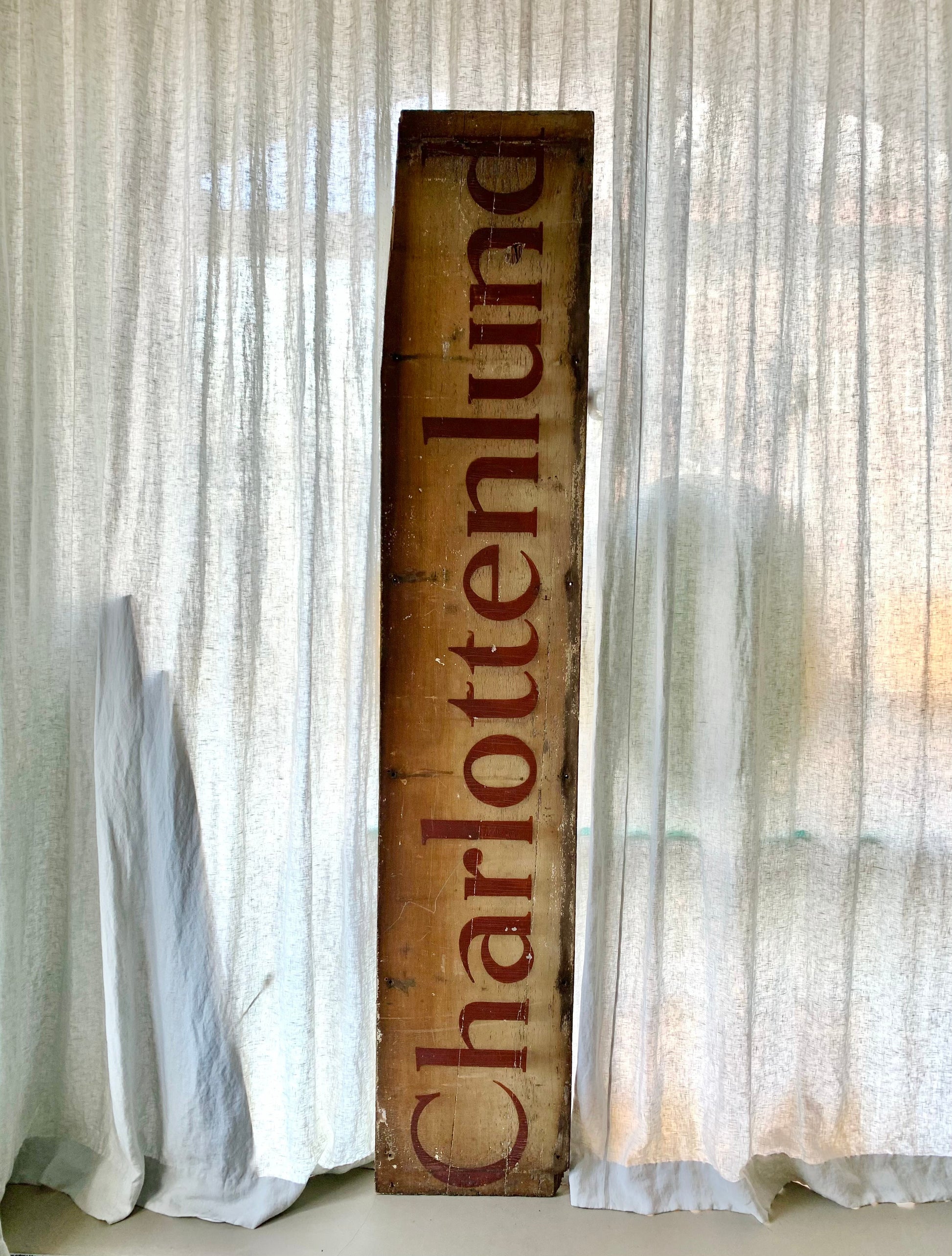 BIG Antique hand painted wooden sign from Charlottenlund station. Great patina.
